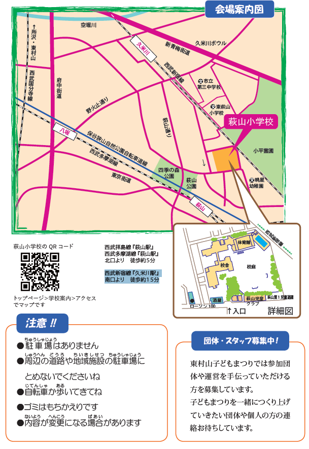 注)東村山には東萩山小学校もありますが、今回の開催は萩山小学校です。お間違えのないように。