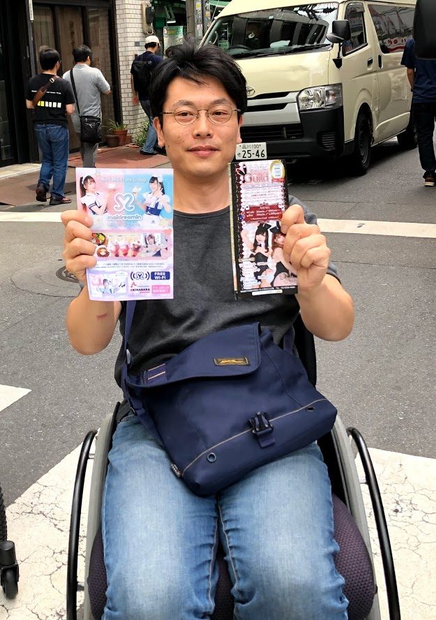 ①路上に立つメイドさんに聞いて回ったところ、この日リサーチした半分のメイドカフェでは車いすのまま入れる。